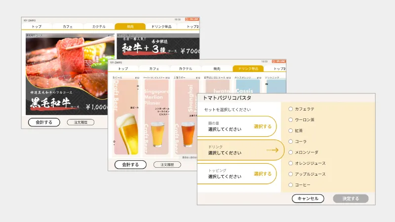 テーブルトップオーダー(TTO)は、卓上のタブレット端末からお客様が自由に注文できるセルフオーダーシステムです。直感的で見やすい画面設計により、メニュー選びから注文までスムーズに完結。