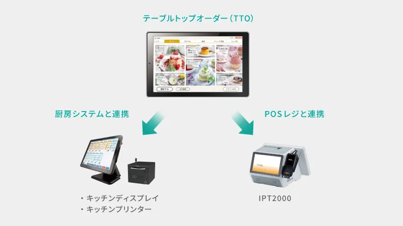 さらにPOSレジや厨房システムと連携することで、注文内容が即時に厨房へ伝わり、スピーディーな料理提供を実現します。お客様の満足度を高めるだけでなく、店舗運営の効率化や客単価アップにも貢献します。