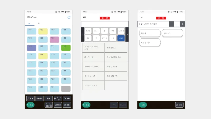 端末上で座席状況を色分け表示し、空席や注文状況を一目で把握可能。