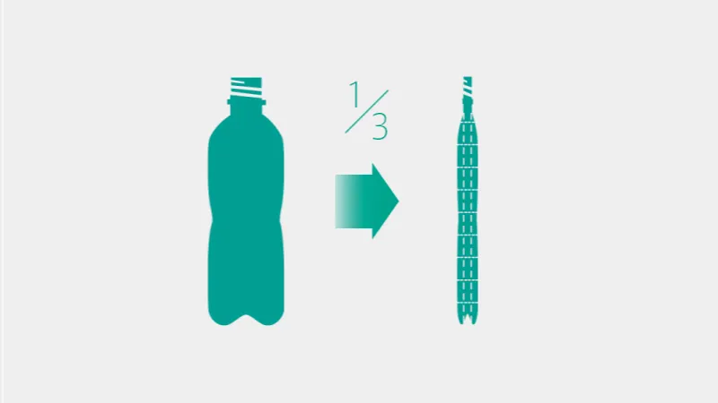 独自の「プレ裁断圧縮方式」により、飲み口部分を破断させずに圧縮。リサイクル資源として高く評価され、国内初の意匠登録も取得しています。