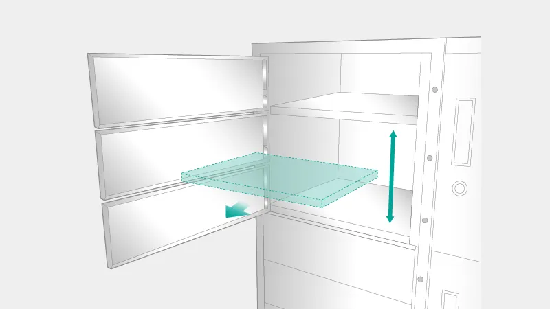 最大12段の収納を備え、A4レターケースが収まるサイズを基本に設計。大きな薬剤には中板を外すことで2段分、3段分と柔軟にスペースを確保できます。薬局の運用に合わせて最適な設計が可能です。