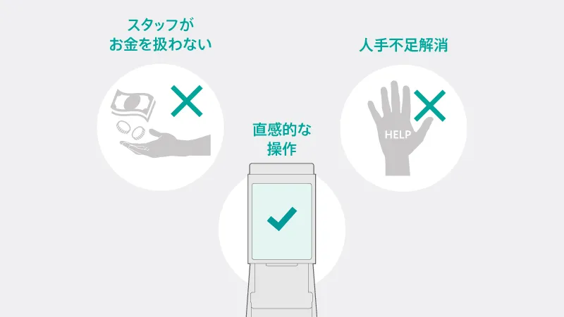 セルフ運用では最少人数での非対面運用が可能で、キャッシュレス決済なら金銭授受も不要。三密回避や接触削減といった衛生面への配慮に加え、状況に応じて「対面」・「フル」への切り替えも柔軟に行えるのが大きな強みです。