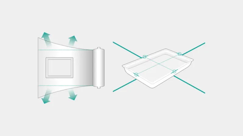 フィルムの性能を最大限に引き出すことでフィルム使用量を軽減させる、TERAOKA独自の「スーパーストレッチ機能」。トレーの奥行き寸法に合わせてフィルムを引き伸ばして包装するため、より小さなフィルムで大きなトレーを包装することが可能です。フィルム使用量を大幅に削減します。