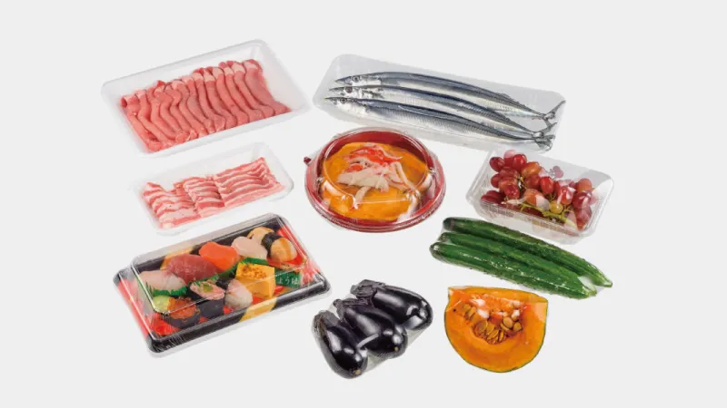 AW-5600FXⅡは、通常の発泡トレーはもちろん、**軟弱トレー・変形トレー・紙トレー・野菜のノントレー包装(素巻き)**まで、幅広い形状の商品をスピーディーに包める包装機です。紙トレーや素巻き包装ではフィルム使用量を最小限に抑え、プラスチック削減にも貢献。